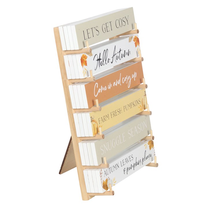 • Placa decorativa de madeira com frases de outono e ilustrações de folhas e abóboras.
