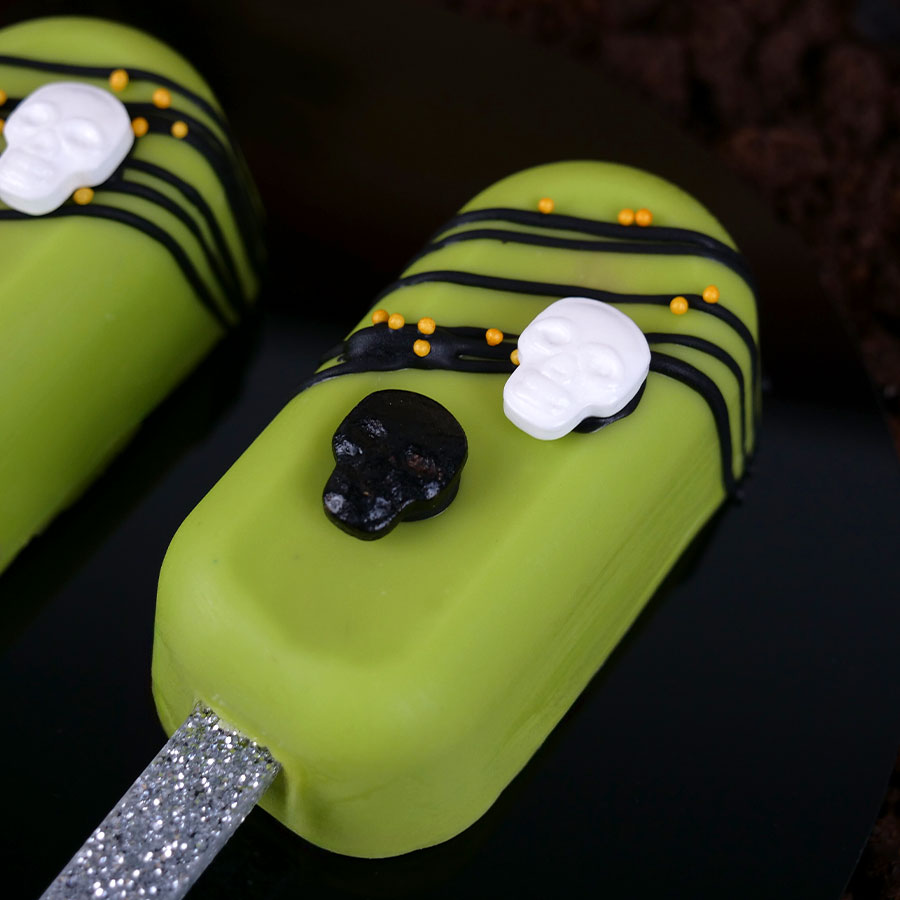 • Gelado retangular verde-lima com decoração de caveiras e listras pretas